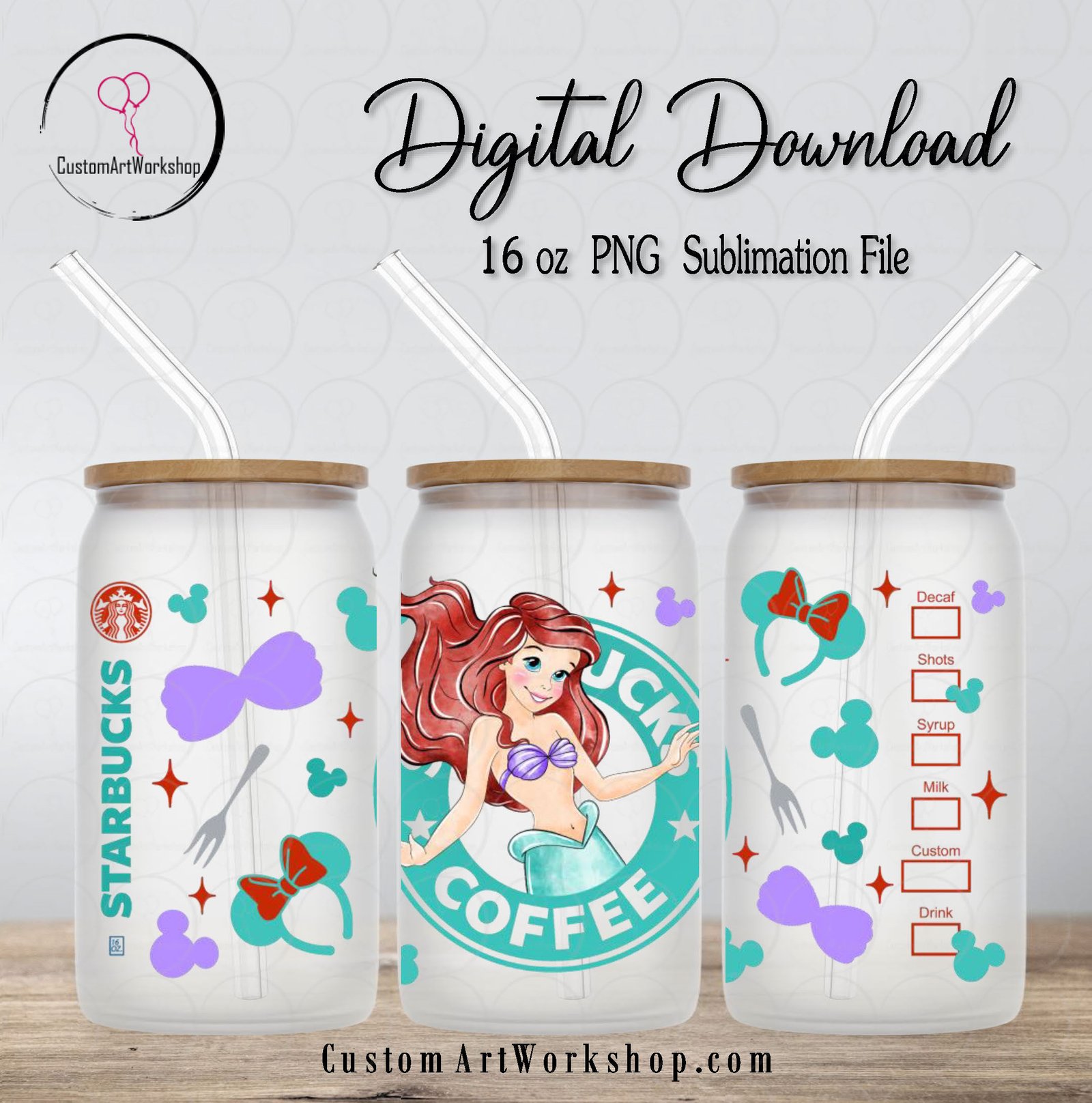 Princess Ariel Amazing Little Mermaid Starbucks Coffee Glass Can Wrap Instant Download