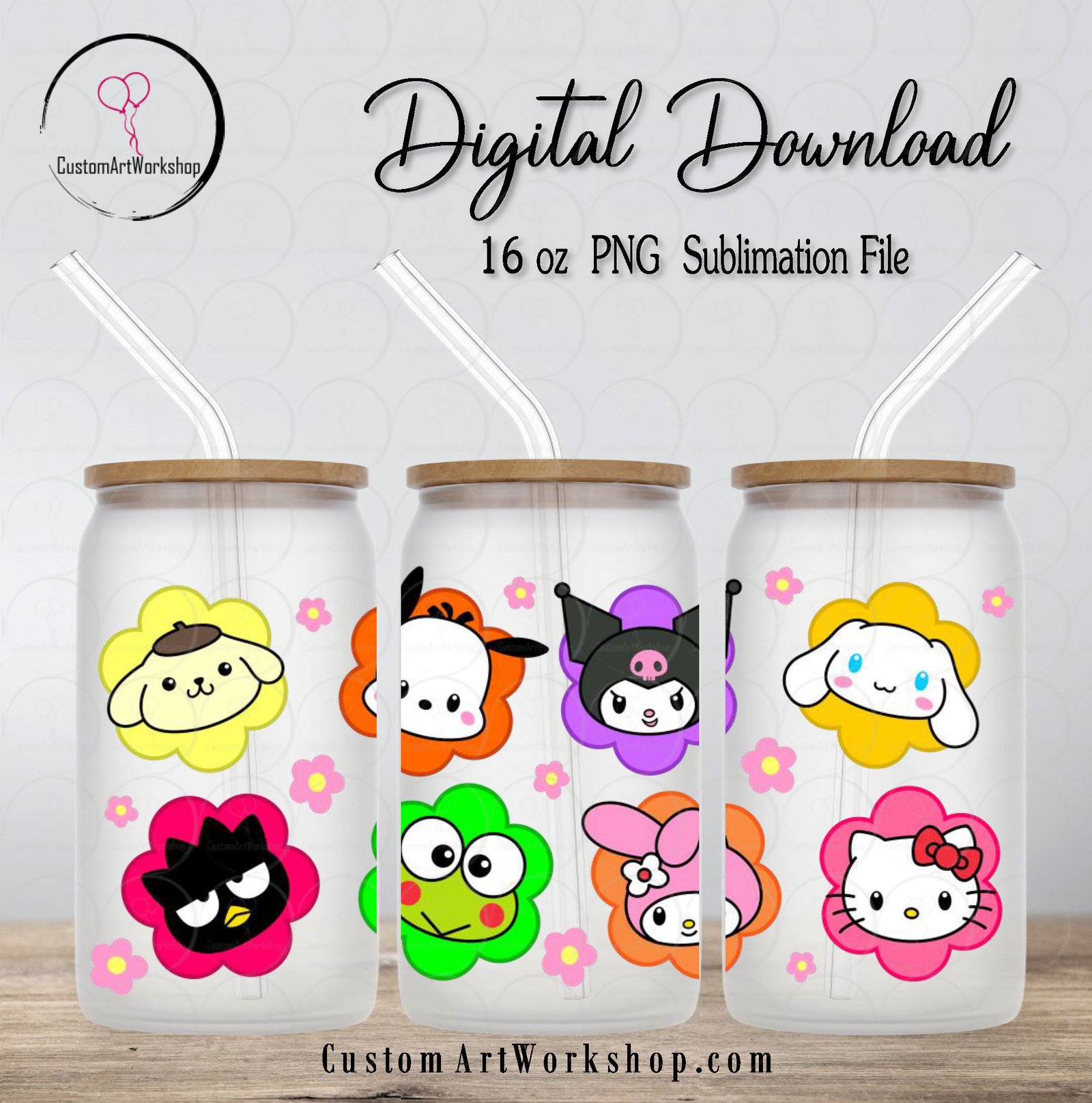 Sanrio Friends Floral Glass Can Wrap Instant Download